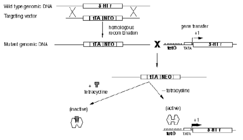 该系统包含两个互补系统,分别为tTA依赖和rtTA依赖的基因敲除系统,现在又被称为Tet―Off (tTA依赖)系统和Tet―On (rtTA依赖)系统。在这两个系统中,四环素控制转录因子tTA或rtTA与启动子Ptec的结合,从而调节下游基因的表达。所不同的是tTA与启动子Ptet的结合是不需要四环素的,四环素阻碍两者之间的相互作用;而rtTA与启动子P1et的相互结合只有在四环素或者其衍生物多西环素(强力霉素)存在的情况下才会发生,没有四环素或者多西环素时两者不发生相互作用。因此这两个系统以相反的方式对四环素进行反应,成为两个互补系统。