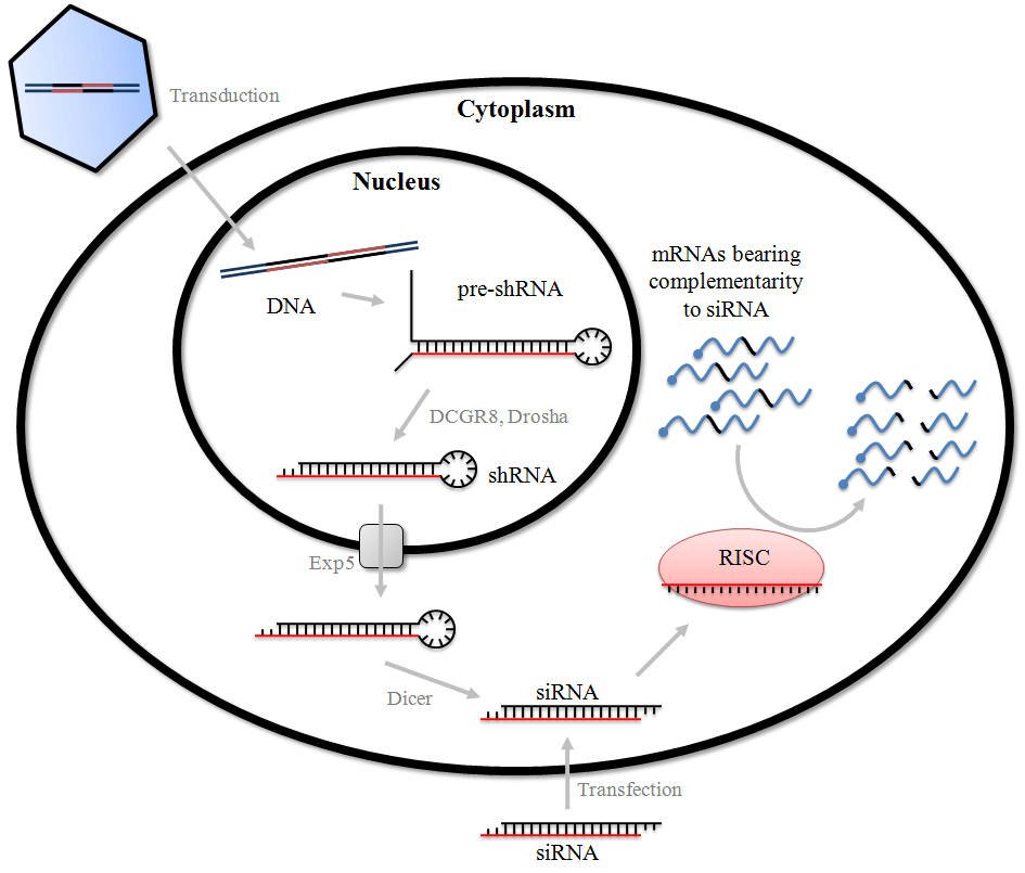 RNA干扰(RNAi)是有效沉默或抑制目标基因表达的过程,该过程通过双链RNA(dsRNA)使得目标基因相应的mRNA选择性失活来实现的。RNA干扰由转运到细胞细胞质中的双链RNA激活。沉默机制可导致由小干扰RNA(siRNA)或短发夹RNA(shRNA)诱导实现靶mRNA的降解,或者通过小RNA(miRNA)诱导特定mRNA翻译的抑制。