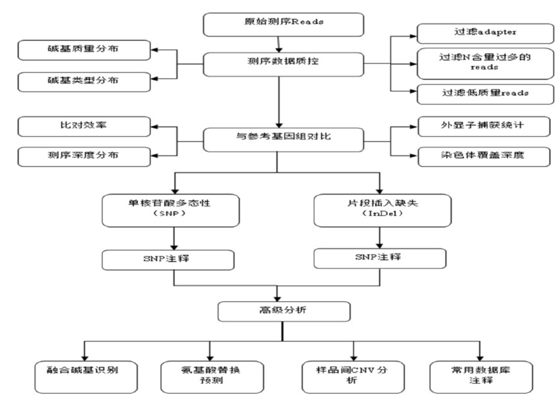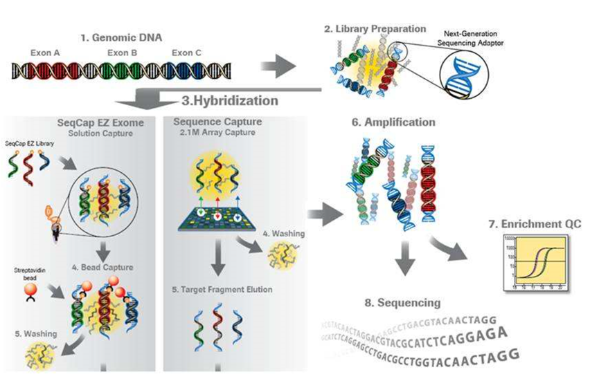 技术流程: 1. 基因组DNA的随机打断 2. DNA片段的末端修复和接头的连接 3. PCR扩增文库 4. DNA液相探针杂交捕获目的片段 5. PCR扩增捕获得DNA片段 6. 测序文库的检测 7. HiSeq 2500测序 8. 生物信息分析