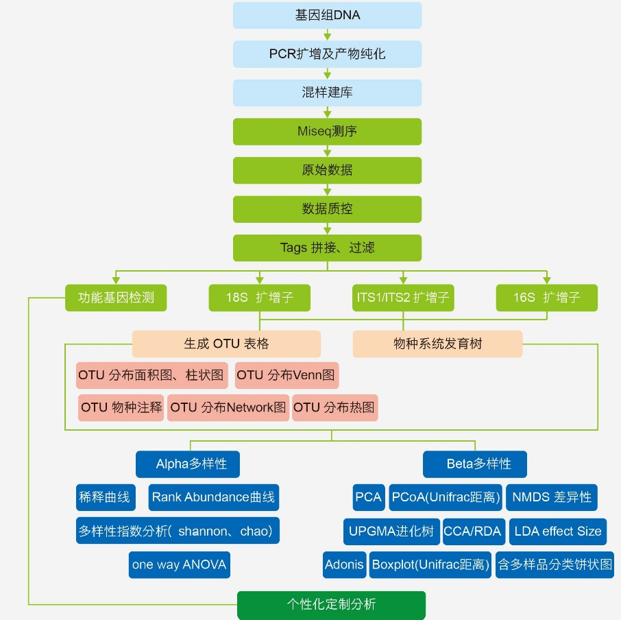 扩增子测序主要包括16S rDNA测序、18S rDNA测序、ITS测序及目标区域扩增子测序等。16S/18S/ITS rDNA,序列包含可变区(Variable region)和保守区(constant region)。可变区序列因细菌而异,且变异程度与细菌的系统发育密切相关,通过提取环境样品的DNA,并扩增和检测其中的一段或几段区域,可以了解环境样品中细菌的分类和丰度。